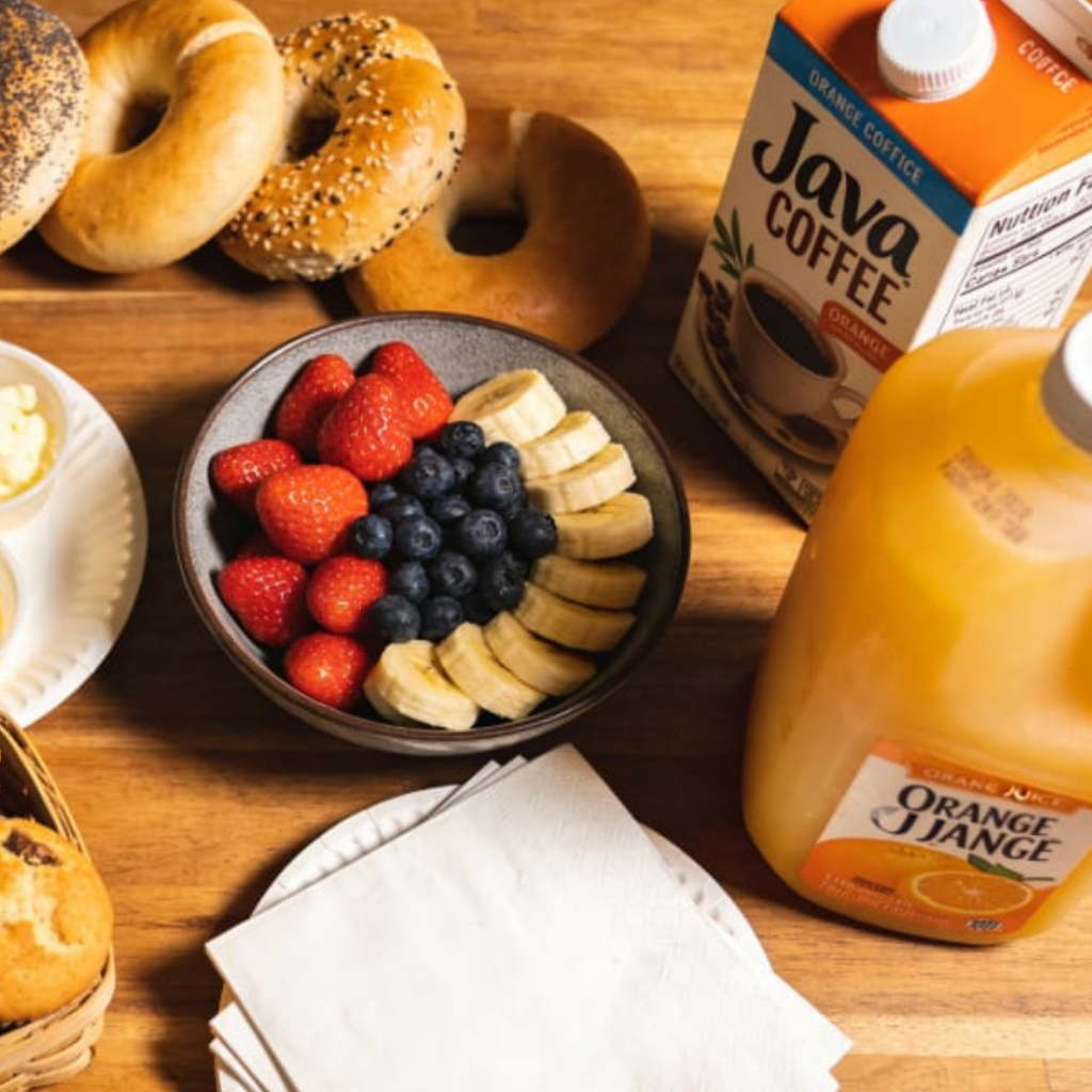 Assorted Bagels, Mini Muffins, Cream Cheese & Butter, Fruit Bowl, Box of Java, Paper Products, ½ Gallon of Orange Juice. (Minimum 12 people)